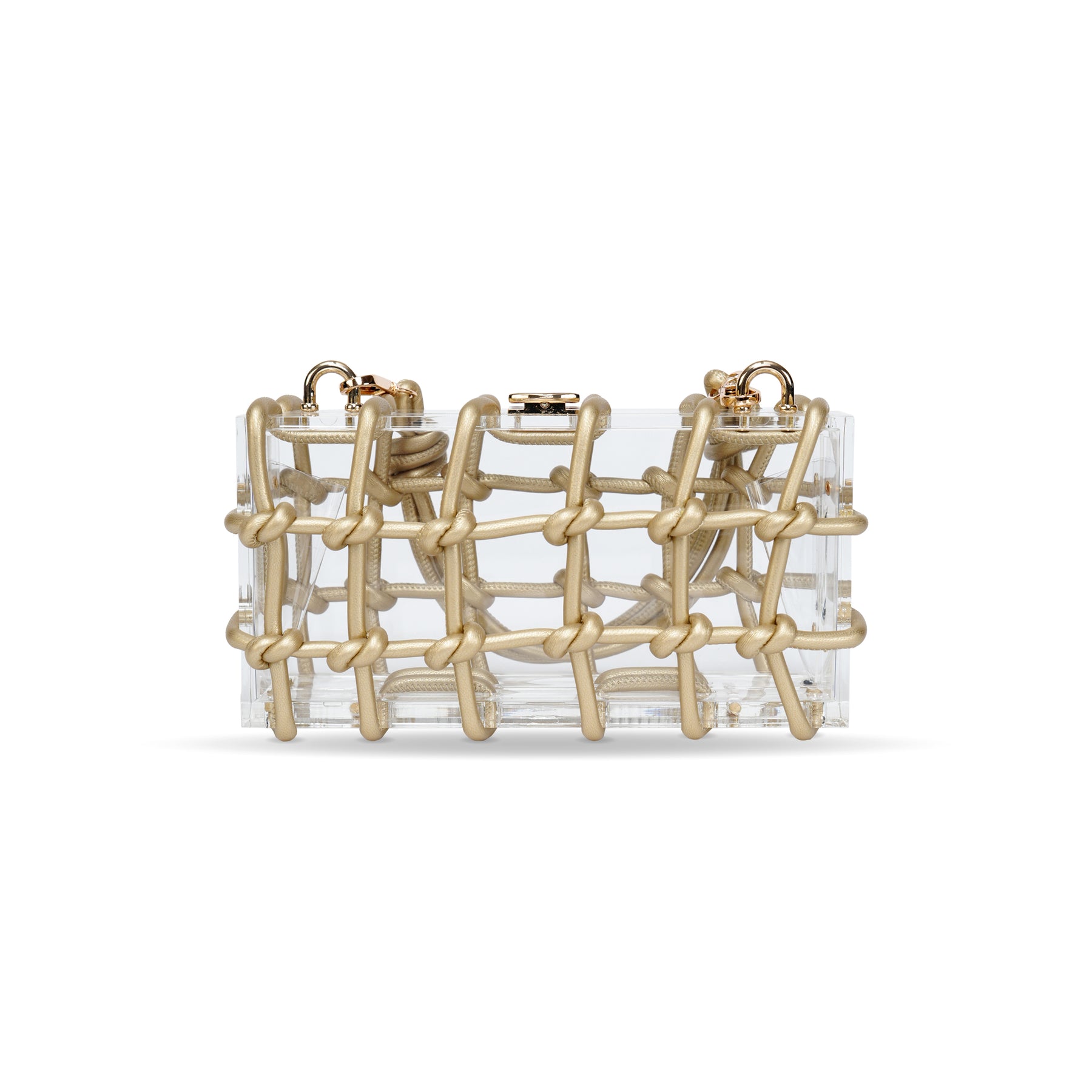 The Gilded Cage Clutch is a striking fusion of art and luxury, featuring a clear acrylic base wrapped in intricate gold lattice detailing.
