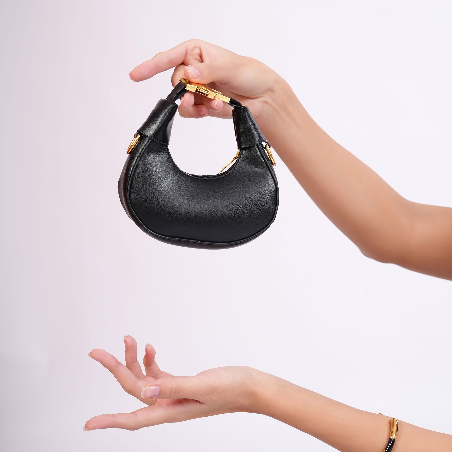 A chic mini clutch crafted in smooth black finish with a gleaming gold handle.